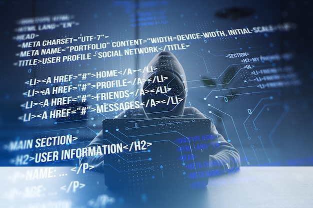 해커가 책상에서 컴퓨터를 사용하여 창의적인 디지털 프로그래밍 언어로 흐릿한 배경에서 소프트웨어 개발자가 악성코드와 html 개념을 해킹하는 측면 보기 이중 노출