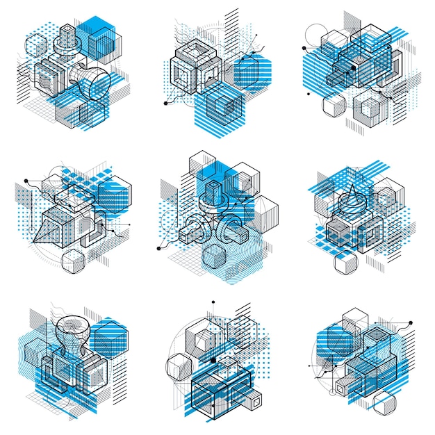 3d 추상 벡터 아이소메트릭 배경입니다. 큐브, 육각형, 정사각형, 직사각형 및 다양한 추상 요소의 레이아웃입니다. 벡터 컬렉션입니다.