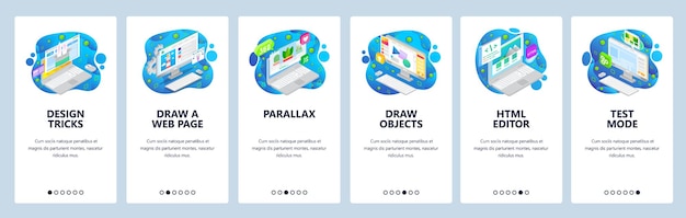 이소메트릭 컴퓨터 아이콘 모바일 앱 온보딩 스크린 웹 사이트 및 모바일 개발을위한 메뉴 터 배너 템플릿 웹 사이트 디자인 평평한 일러스트