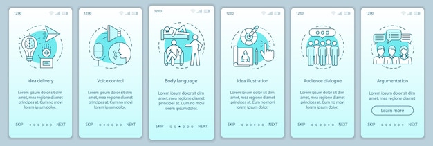 전문적인 품질 온보딩 모바일 앱 페이지 화면 벡터 템플릿. HR 소프트 스킬. 상상, 실험, 재구성. 연습 웹 사이트 단계. UX, UI, GUI 스마트폰 인터페이스 개념