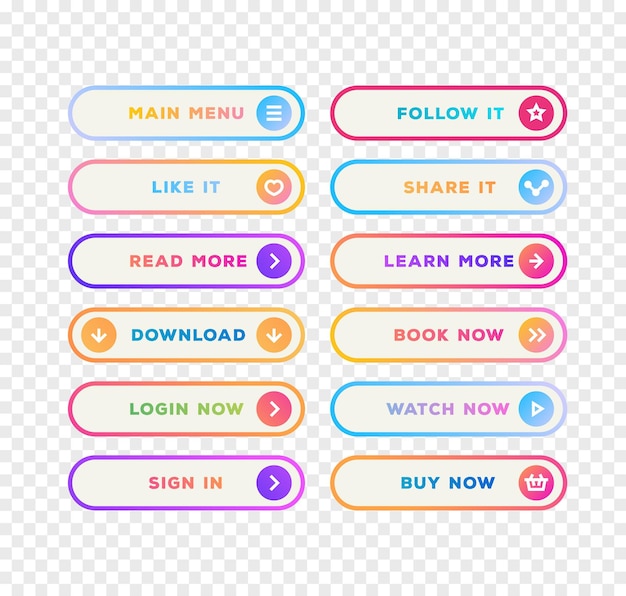웹 사이트 및 모바일 앱을위한 투명한 배경에 고립된 사용자 인터페이스 아이콘과 함께 터 버튼 그라디언트 라인 스타일의 집합 액션 아이콘 버튼 10 eps